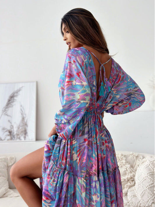 Deep V multi-color printed slit dress with three-quarter sleeves